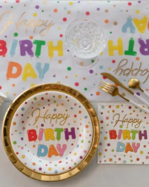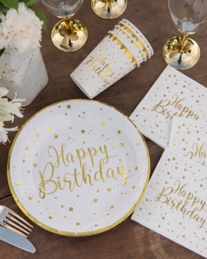 «Happy Birthday» & Gullstjerner – Hvit – 7,8 x 9,7cm