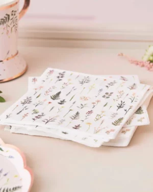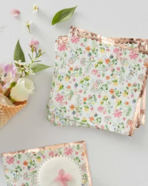 Blomstertrykk servietter med gyllen kant – Hvit – 17cm H x 18cm B