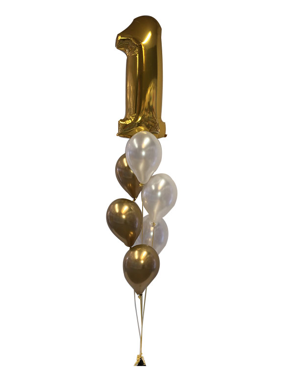 Ballongbukett med lateks og folieballonger. Buketten består av lateksballonger i gull (chrome) og hvit og et stort gullfarget ettall i folie. Buketten fylles med helium og vi tar på Ultra High Float på lateksballongene så den varer ekstra lenge. Kjempefin pynt på 1 årsdagen eller som gave til jubilanten. Kommer i størrelsene liten, medium, stor og XL. Det er liten som er avbildet. I den lille er det 6 lateksballonger og 1 folietall, i medium er det 10 lateksballonger og 1 folietall, i den store er det 14 lateksballonger og 1 folietall og i den største er det 18 lateksballonger og 1 folietall. All vår dekor håndlages for hver gang, og det vil kunne oppstå varisjoner i forhold til det du ser avbildet.