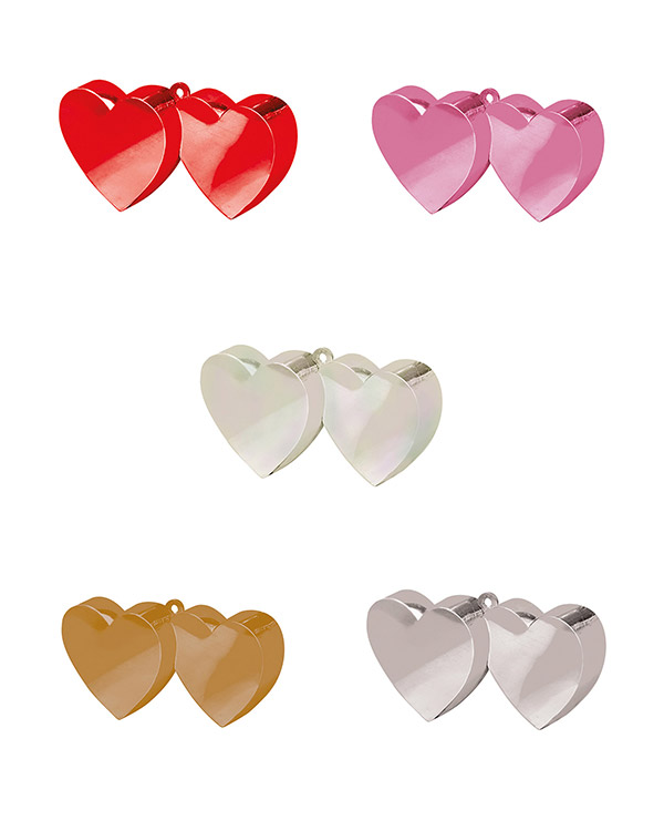 Ballongvekt på 170 gram formet som to hjerter. En ballongvekt brukes til å holde ballongen eller ballongbuketten på plass, samtidig som den er dekorativ. Kommer i gull, iriserende, rød, rosa og sølv.
