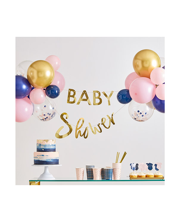 Banner med teksten «Baby Shower» og ballongdekor i forskjellige farger. Girlanderet er 3m, og kan henges opp på alle typer vegger. Kan fylles med helium eller vanlig luft. Vi anbefaler våre kunder å kjøpe med en ballongvekt slik at ikke ballongene flyr avgårde.