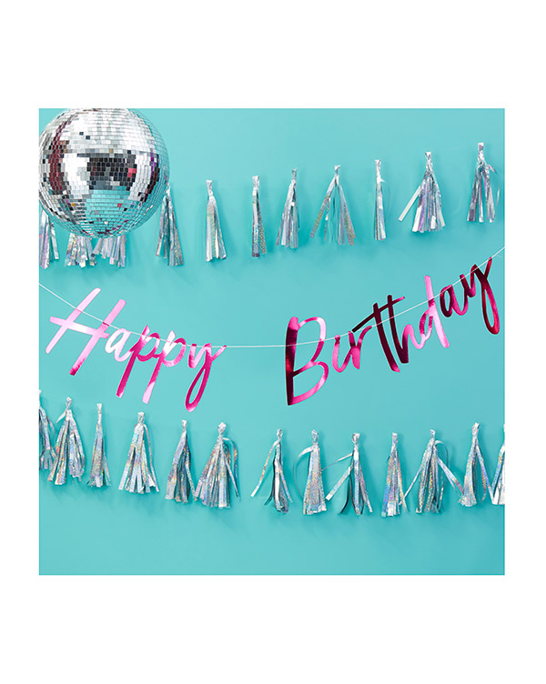 1 stk. Girlander med rosa farge og teksten «Happy Birthday». Passer perfekt som dekor til bursdagsfest, eller som en gave til bursdagsbarnet. Girlanderet kommer på en snor, og er 2m langt. Kan henges opp på alle typer vegger.