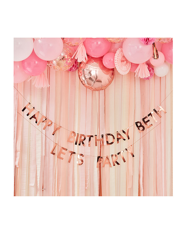 Banner/girlander og 84 roségullfargede bokstaver. Miks og match bokstavene så du kan skrive jubilantens navn og for eksempel «Happy Birthday». Perfekt pynt på bursdagsfeiringen så bursdagsbarnet føler seg ekstra spesiell på den store dagen.