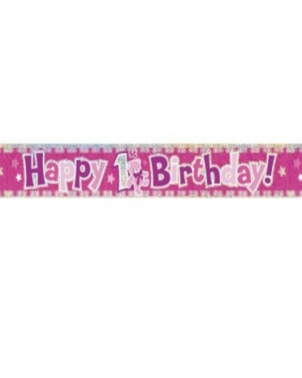 Banner: «Happy 1st birthday» – Glitrende effekt – Rosa – 3m