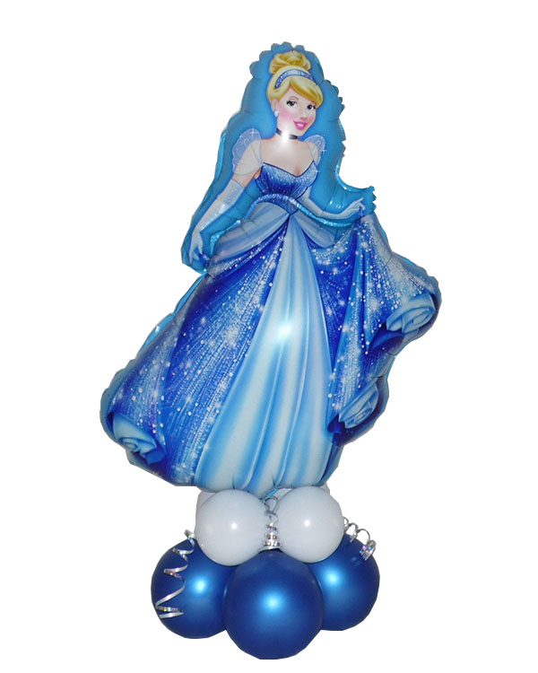 Borddekorasjon til bursdag. Små lateksballonger i blå og hvit under og stor folieballong på toppen formet som Askepott. Dekorasjonen kan settes på bordet på bursdagsselskapet for å gjøre det litt ekstra stas. All vår dekor håndlages for hver gang, og det vil kunne oppstå varisjoner i forhold til det du ser avbildet.