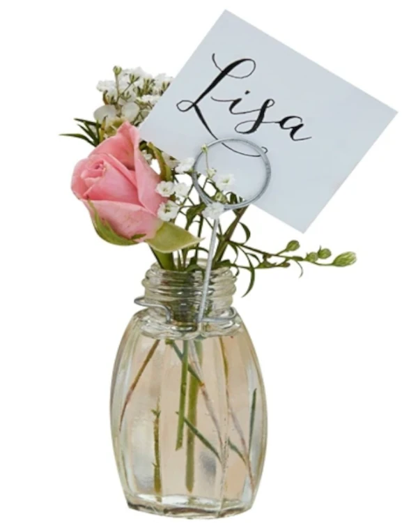 Denne elegante bordkort holderen er perfekt for å legge til en touch av stil og glamour til ethvert arrangement. Laget av glass vil denne bordkort holderen definitivt skille seg ut på festbordet. Med en høyde på 7 x 11 cm passer den perfekt til å vise frem navnene til gjestene dine på en elegant måte. Enten det er et bryllup, en bursdag eller en annen spesiell anledning, vil denne bordkort holderen være et flott tillegg til dekorasjonene dine. Gjør festen din enda mer minneverdig med denne vakre bordkort holderen.