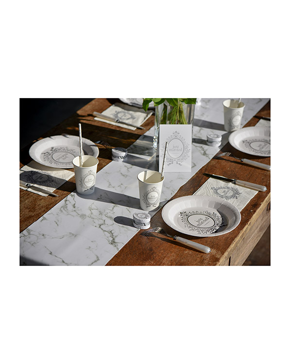 Bordløper på 3m x 28 cm. Duken er hvit med marmormønster. Denne løperen er perfekt til både hverdags og fest.