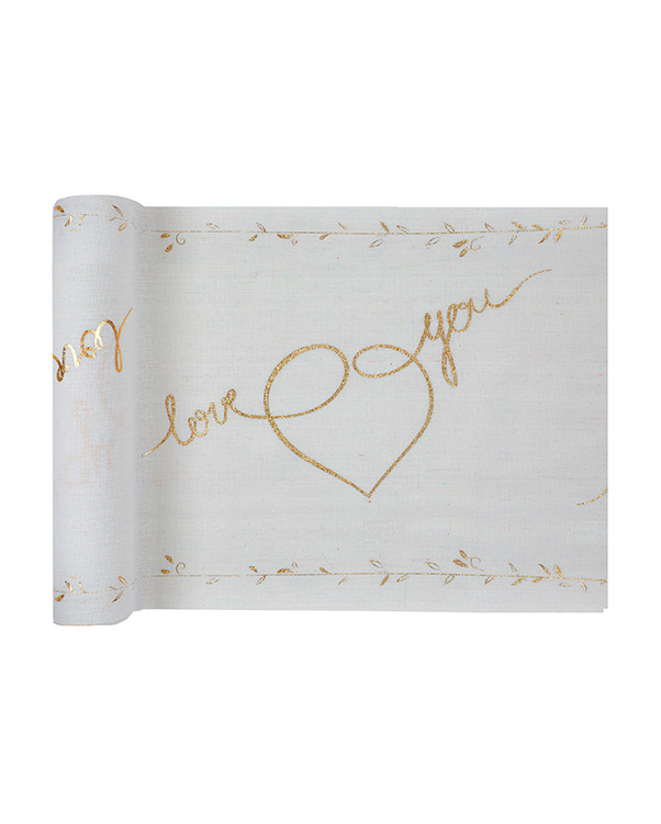 Bordløper på 3m x 28 cm. Duken er hvit med gullskrift hvor det står «I love you». Denne løperen er perfekt pynt i et bryllup eller en jubileumsfeiring.