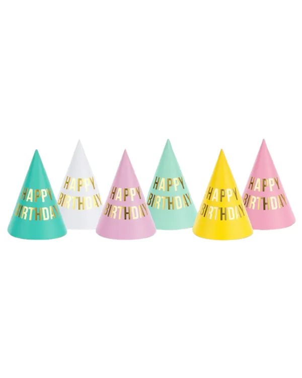 Gjør bursdagsfeiringen enda mer spesiell med disse fantastiske festhattene! Med en pakke på 6 hatter er det nok til å glede alle gjestene. Hattene er dekorert med den glitrende teksten «Happy Birthday» i gull, som virkelig gir en festlig og glamorøs touch.