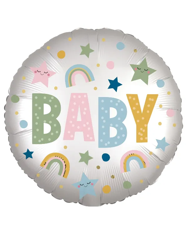 Denne fargerike folieballongen med motivet «Baby» er perfekt for å feire den lille nyankomne. Ballongen er dekorert med vakre regnbuer og stjerner, og vil definitivt skape en feststemning. Med en størrelse på 43cm er den ideell for å henge opp eller bruke som en del av en ballongbukett. Lag en minneverdig feiring med denne søte folieballongen!