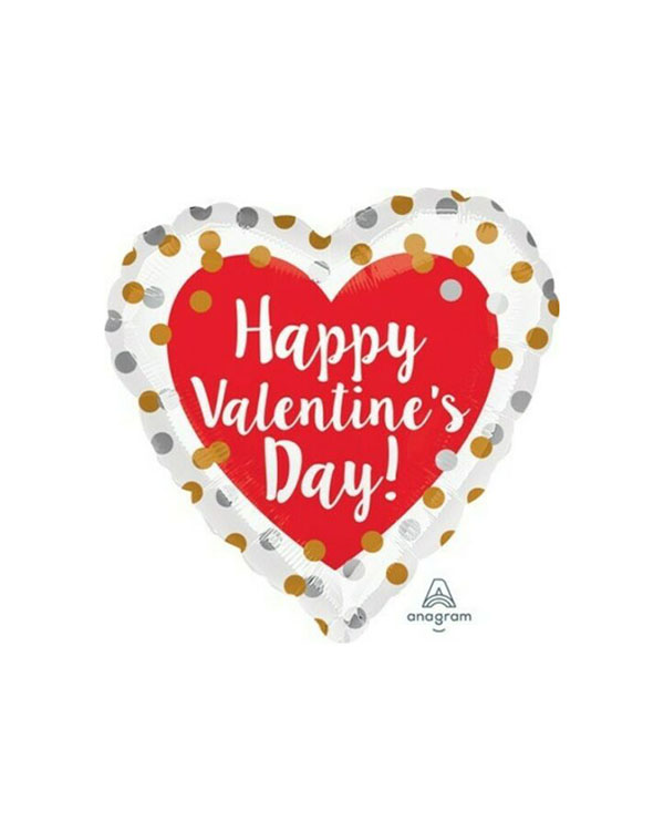 Folieballong: «Happy Valentine’s Day» – Hjerte med gull & sølv prikker – 45cm