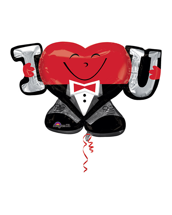 1 stk folieballong på 83×53 cm. Denne ballongen er formet som teksten «I <3 U" hvor hjertet i midten er en liten mann med dress. En morsom ballong du kan gi din kjære som en ekstra oppmerksomhet. Gi ballongen som en kjærlighetserklæring på f.eks Valentinesday, jubileum eller bursdag. Kan fylles med luft eller helium. Bruk gjerne en ballongvekt så den ikke flyr sin vei.