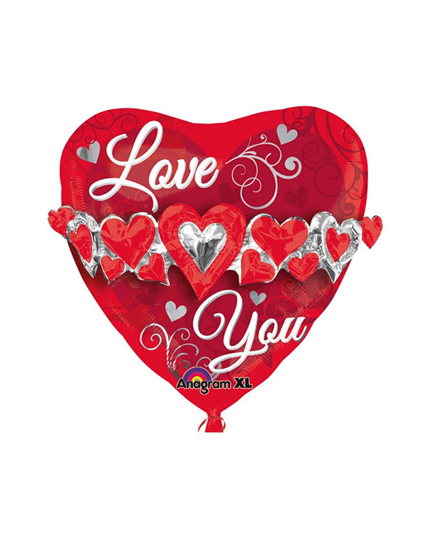 1 stk hjerteformet folieballong på 58 cm. Ballongen er rød med røde og sølvfargede hjerter rundt som et kjede og teksten » Love You» med hvit skrift i midten. Gi ballongen som en kjærlighetserklæring på f.eks Valentinesday, jubileum eller bursdag. Kan fylles med luft eller helium. Bruk gjerne en ballongvekt så den ikke flyr sin vei.