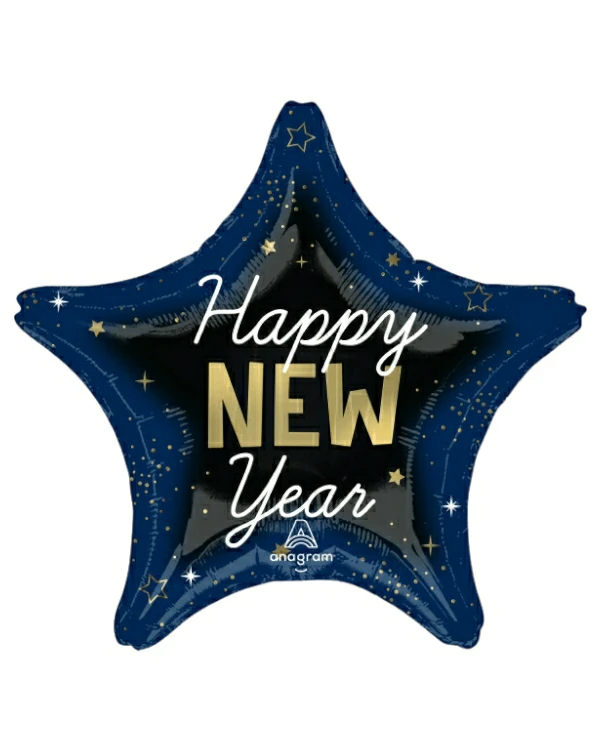 Folieballonger: «Happy New Year» – Stjerner – Blå, Svart, Gull, Hvit – 43cm