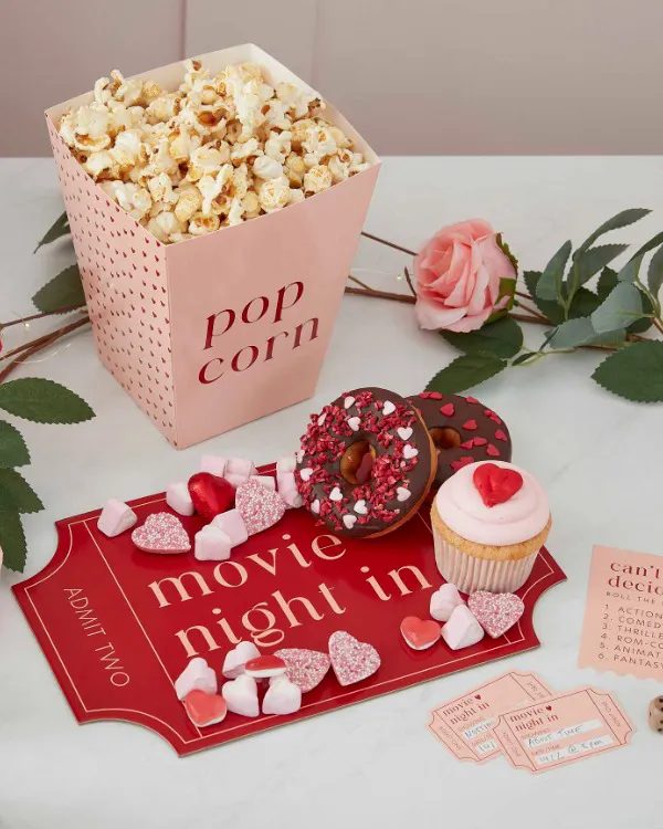 Gavepose / Godtepose (5stk): Film kveld boks – Popkorn og godt – Rød, rosa, grønn – 18cm