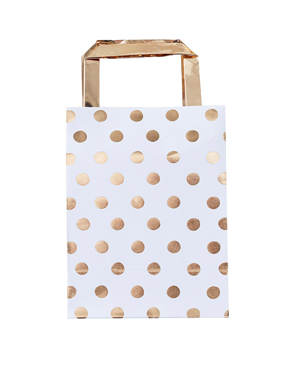 5 stk. Gaveposer med gullfarget håndtak, gullprikker og hvit bakgrunnsfarge. Passer perfekt til lanseringsfester og andre festlige anledninger hvor du ønsker å gi bort «giveaways». Gaveposene måles 26 x 9cm i størrelse.