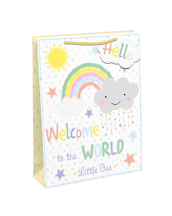 1 stk gavepose. Gaveposen har bilde av en sky, en regnbue, en sol og teksten «Welcome to the world little one». Perfekt til å pakke inn gaven til den nyfødte. Eller du kan kjøpe fler, fylle de med godsaker og dele de ut på babyshower. . Gaveposen er på 33 x 26cm