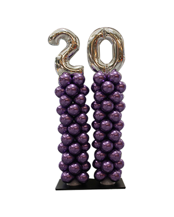 Lekker ballongsøyle med lilla og sølvfargede ballonger. Her søylen er lagd av lateksballonger med folieballong i sølv formet som tall eller bokstaver. Kjøp gjerne 2 eller flere som på bildet for å sette sammen budskapet. Fylles med luft. Perfekt dekorasjon utenfor en fest, en grand opening eller noe lignende hvor du trenger litt ekstra pynt. Vi bruker High Float på all vår dekor så de skal vare så lenge som mulig. Vi kan også lage andre Ballongsøyler på forespørsel. All vår dekor håndlages for hver gang, og det vil kunne oppstå varisjoner i forhold til det du ser avbildet.
