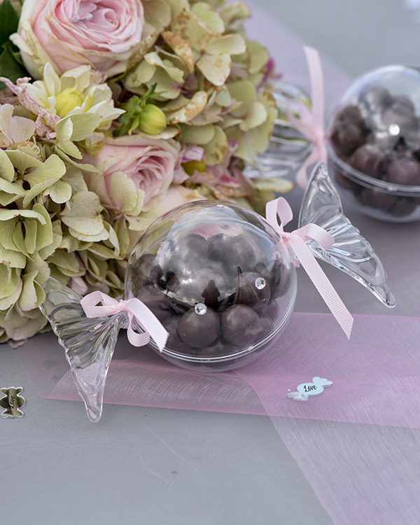 Gjennomsiktig ball formet som et godteri på 8 x 14,8 cm til å ha godteri inni. Legg de på tallerknene til gjesten for en koselig overraskelse på festen.