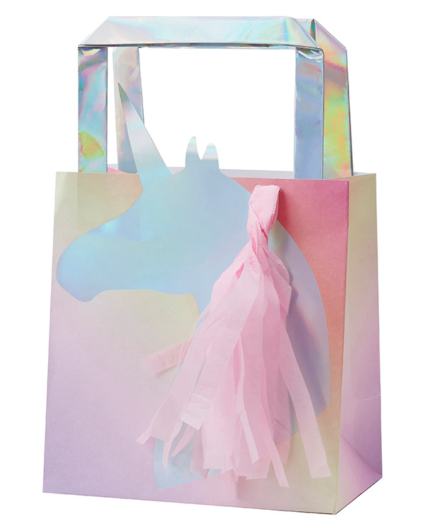 5 stk godteposer på 26 cm. Iriserende farger med en sølvafarget enhjørning med rosa man. Perfekt for magiske enhjørings-bursdagsferinger, del de ut til gjestene og gjør dagen helt spesiell. Vi har girlander med samme motiv hvis du ønsker et gjennomført enhjøringstema.