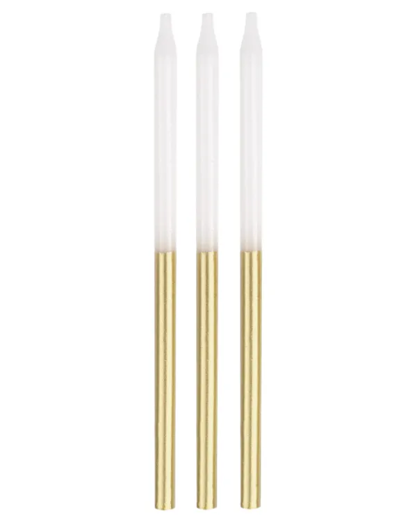 Hvert kakelys er 12,7 cm langt, noe som gjør dem ideelle for de fleste kakestørrelser. De lyse og festlige fargene i gull og hvit vil virkelig skille seg ut og gjøre kaken din til et imponerende blikkfang.
