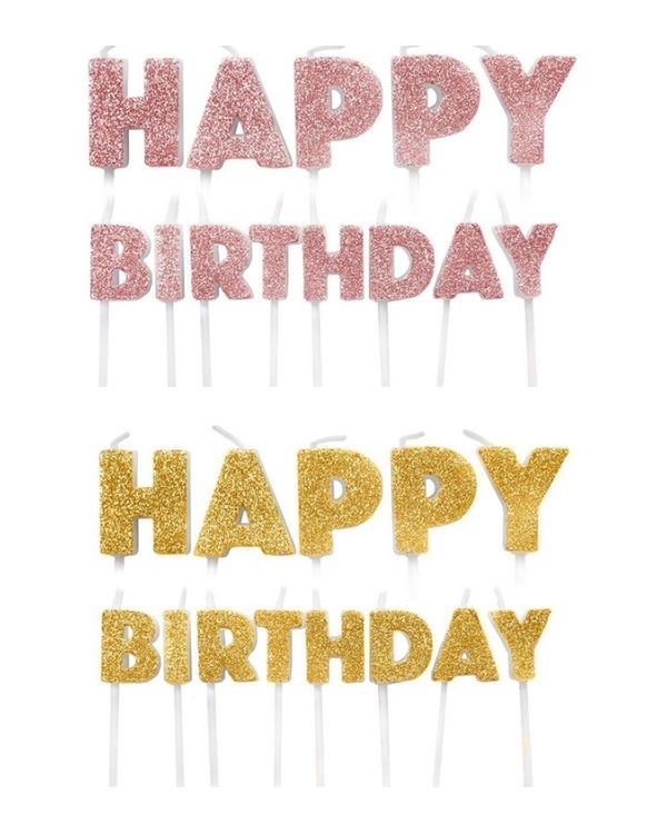 13 stk kakelys som staver «Happy Birthday». Kommer i roségull og gull. Perfekt pynt på bursdagskaken til jubilanten på den store dagen. Lysene måler 5,5 x 7,5cm.