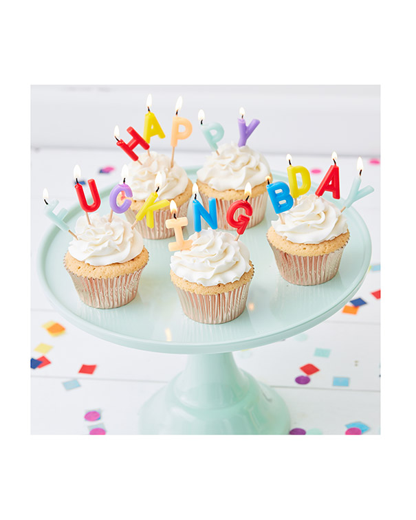 Kakelys i ulike farger som staver «Happy Fucking Bday». Morsomme kakelys som gir det lille ekstra til bursdagskaken.