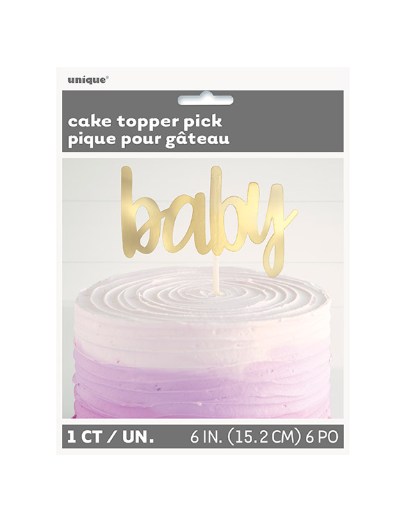 Kaketopp med teksten «Baby» i sølv eller gull. Diskre, lekker kaketopp som passer perfekt på babyshower.