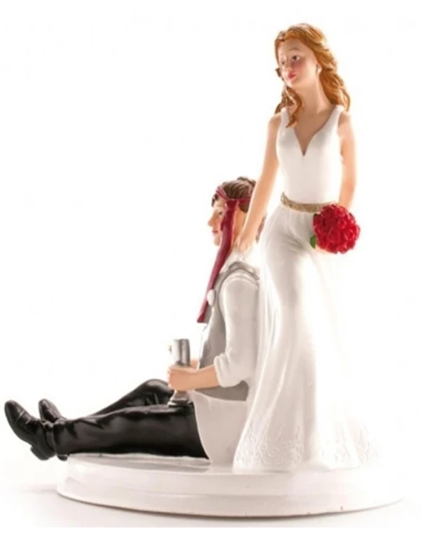 Figur av en beruset brudgom trukket av bruden. Denne vakre kaketoppen er laget av høykvalitets Poselenmateriale som gir den et elegant utseende. Våre kaketopper er laget med fokus på detaljer og høy kvalitet. De er også slitesterke og kan brukes som et minne om bryllupet i årene som kommer. Denne figuren som representerer et brud og brudgom vil være perfekt og vil bringe et snev av humor til kaken din under et bryllup, en minneverdig dag.