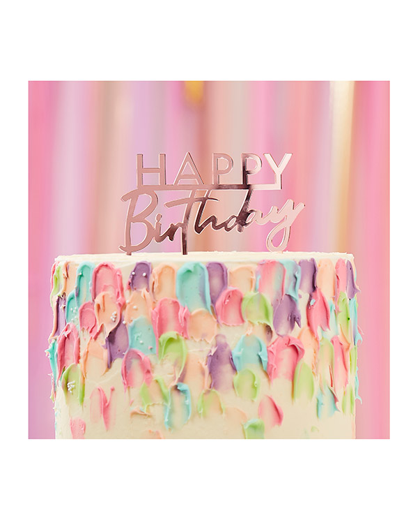 Kaketopp på 11 x 12 cm med teksten «Happy Birthday» i rosa. Putt den på toppen av kaken for å gjøre den ekstra fin og spesiell.