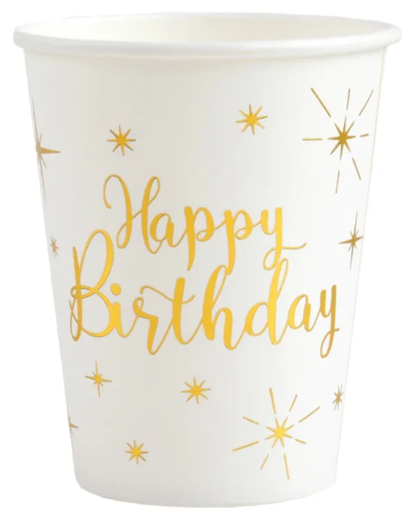 Dette settet med 10 kopper er perfekte for å feire en spesiell bursdag! Koppene har en strålende gullfarge som vil legge til en ekstra touch av glamour til festen din. Med en størrelse på 9,7 cm er de ideelle for å servere dine gjester en forfriskende drikke. Hver kopp er laget av høykvalitetsmaterialer for å sikre holdbarhet og langvarig bruk. Gjør festen uforglemmelig med disse glitrende bursdagskoppene i gull!
