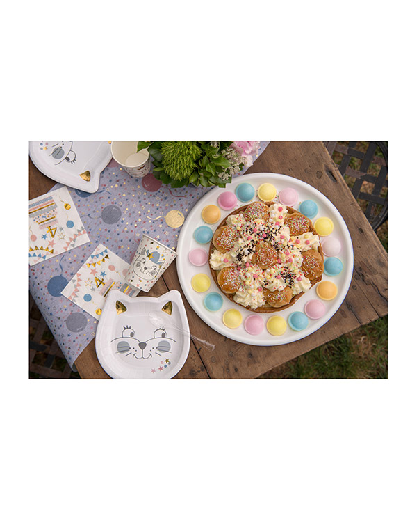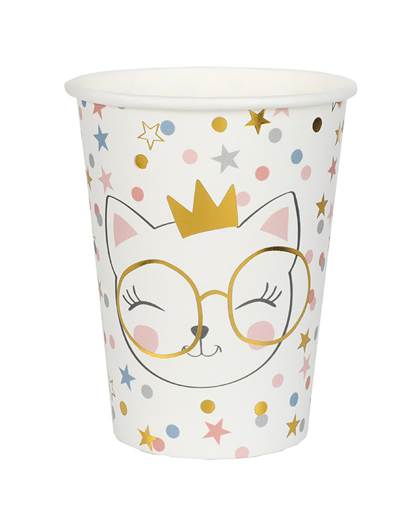 10 stk pappkopper med bilde av en katt med gullbriller og gullkrone. Perfekt pynt i bursdagsfest til et kattefrelst bursdagsbarn. Størrelsen på koppene er 9,7 cm.