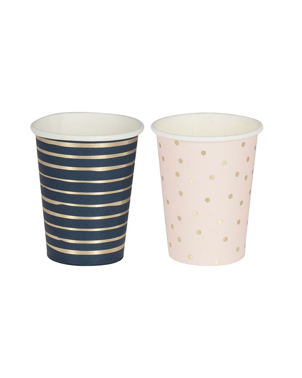 8 stk pappkopper. 4 stk rosa med gullprikker og 4 stk blå med gullstriper. Koppene passer perfekt til all slags festligheter. Størrelsen på koppene er 13,5 x 8 cm.