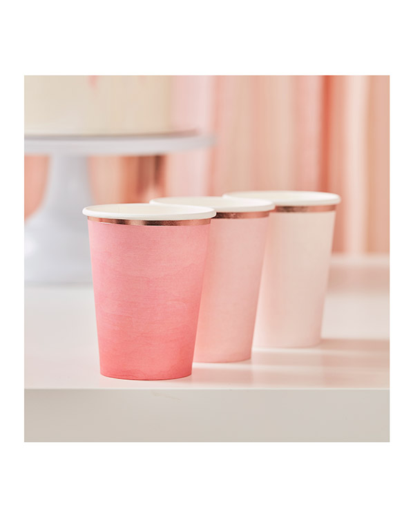 8 stk pappkopper. Koppene er i ulik rosa ombréfarger med gullkant. Perfekt til all slags festligheter. Størrelsen på koppene er 9 x 7 cm.