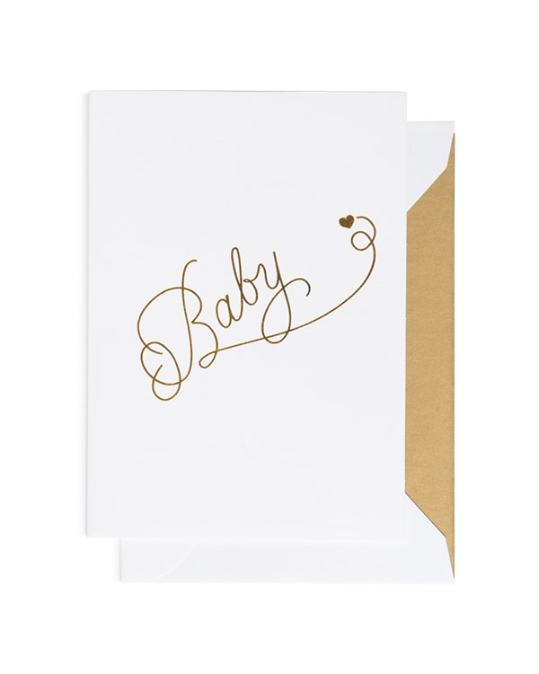 1 stk. Kort med teksten «Baby». Kortet har en hvit bakgrunnsfarge med gullfarget tekst og et hjerte på seg. Kommer i A7 størrelse. Passer som gavekort til din samboer, kjæreste eller ektefelle.