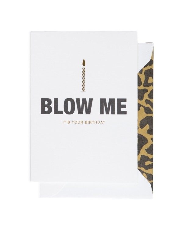 Kort med teksten «Blow Me It’s Your Birthday». Kortet har en hvit bakgrunnsfarge med gullfarget tekst. Kommer i A6 størrelse. Passer som gavekort til din samboer, kjæreste eller ektefelle.