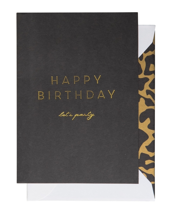 Kort med teksten «Happy Birthday» med cocktail-motiv. Kortet har en hvit bakgrunnsfarge med gullfarget tekst. Kommer i A6 størrelse. Kult bursdagskort som du kan overraske en venn med.