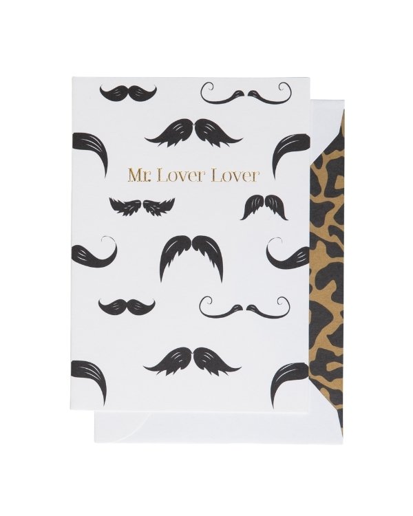 Kort med teksten «Mr. Lover Lover». Kortet har en sort bakgrunnsfarge med gullfarget tekst. Kommer i A6 størrelse. Morsomt kort man kan gi bort til både kjærester og partnere.