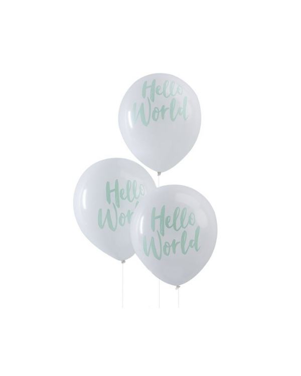 Legg til klasse med White & Mint Green Hello World Balloons Hver pakke inneholder 10 ballonger. Nydelig hvit og mintgrønn Hello World Balloons, perfekt for å lage et trendy baby shower-oppsett.
