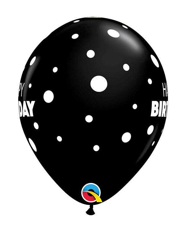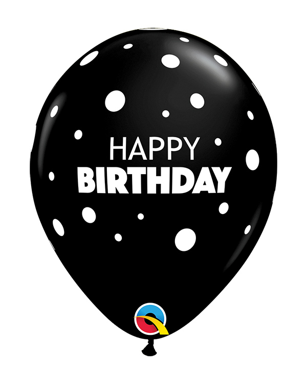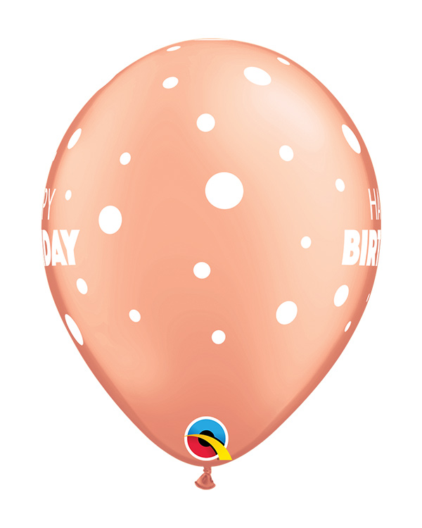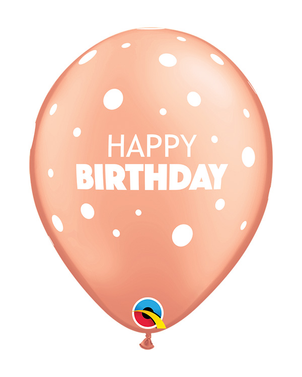 25 stk lateksballonger på 28 cm. Ballongene er en blanding av svarte, gullfargede og roségullfargede med hvite prikker og teksten «Happy Birthday». Fyll de med luft eller helium. Kjøp med Ultra High Float du kan smøre på ballongbuketten så den varer ekstra lenger. Vi anbefaler også å kjøpe en ballongvekt så den holder seg på samme sted hele kvelden. Alle våre lateksballonger er nedbrytbare i naturen på lik linje med et eikeblad.
