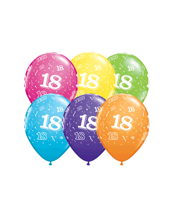 50 stk. Fargerike lateksballonger med tallet «18». Passer perfekt til å feire jubileer, eller til å markere store bursdager i lystige lag. Ballongene kan bli opptil 28cm store når de blåses opp. Alle våre lateksballonger er nedbrytbare i naturen på lik linje med eksempelvis eikeblader.