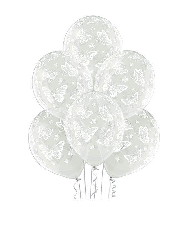 50 stk. Lateksballonger med sommerfuglmotiv. Ballongene har en transparent Crystal-bakgrunnsfarge, og kan bli opptil 30cm store når de blåses opp. Vakre ballonger med smakfulle motiver som passer perfekt til din neste fest. Alle våre lateksballonger er nedbrytbare i naturen på lik linje med eksempelvis eikeblader.