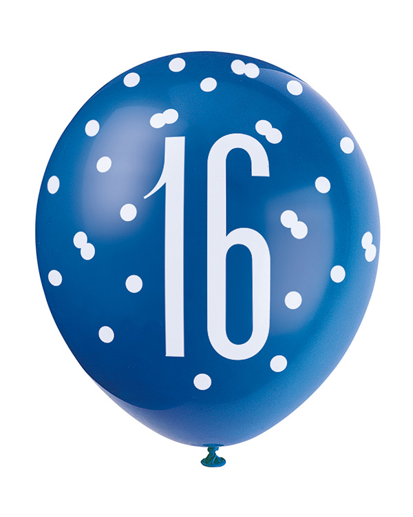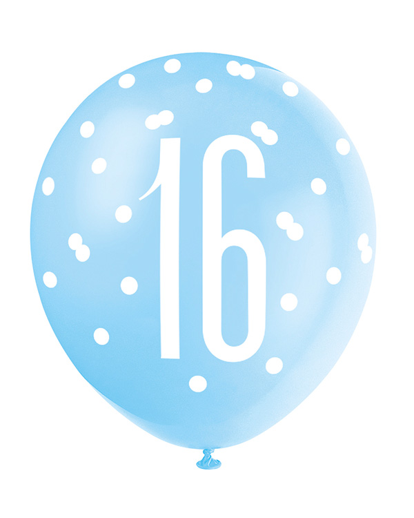 Lateksballonger (6stk): «16» – Blå & Sølv Glitz – 30cm