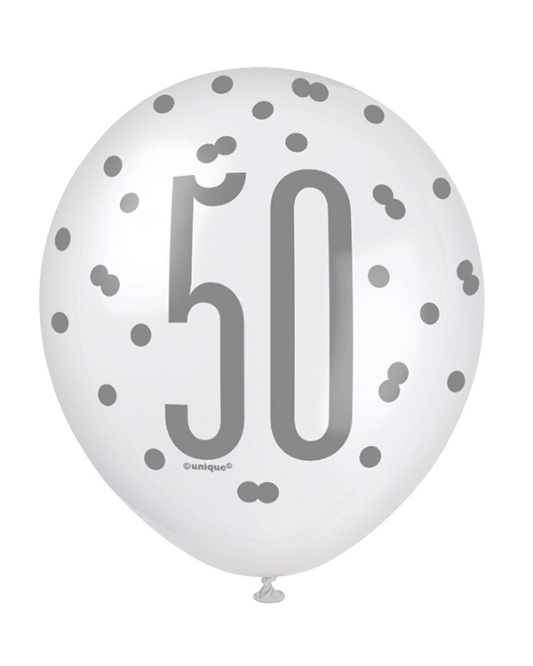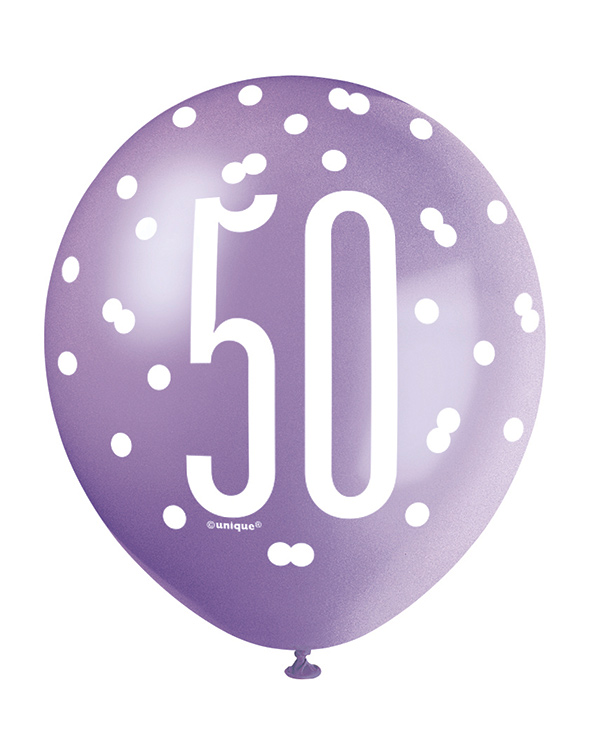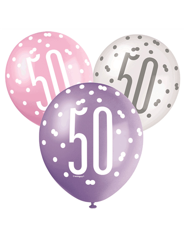 Lateksballonger (6stk): «50» – Rosa, Lilla, Hvit & Sølv – 30cm
