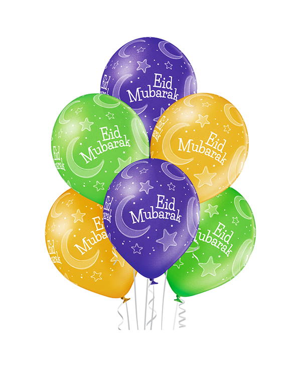 6 stk. Lateksballonger dedikert til feiringen av Eid Mubarak. Ballongene er dekorert med halvmåne og stjerner, med teksten «Eid Mubarak». Kommer i de metalliske fargene lime-grønn, gull og lilla. Ballongene kan bli opptil 30cm store når de blåses opp. Passer perfekt til feiringen av Eid Mubarak. Alle våre lateksballonger er nedbrytbare i naturen på lik linje med eksempelvis eikeblader.