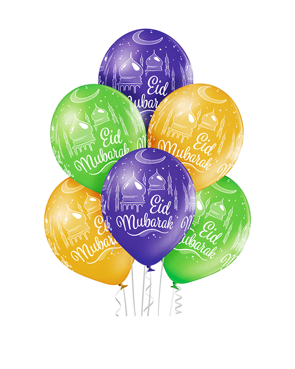 6 stk. Lateksballonger dedikert til feiringen av Eid Mubarak. Ballongene er dekorert med vakre moskeer og halvmåner, med teksten «Eid Mubarak». Kommer i de metalliske fargene lime-grønn, gull og lilla. Ballongene kan bli opptil 30cm store når de blåses opp. Passer perfekt til feiringen av Eid. Alle våre lateksballonger er nedbrytbare i naturen på lik linje med eksempelvis eikeblader.