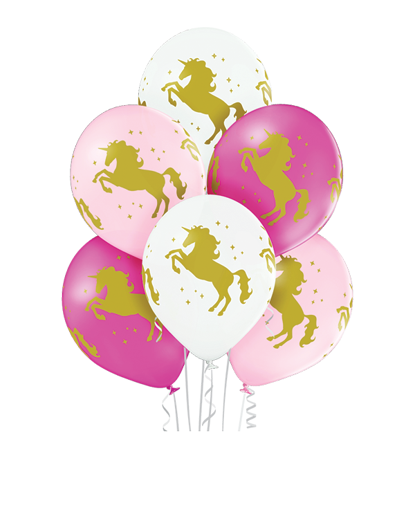 6 stk. Lateksballonger dekorert med enhjørninger i gullfarge. Settet kommer med tre forskjellige bakgrunnsfarger i pastell: Hvit, rosa og «Rose». Ballongene kan bli opptil 30cm store når de blåses opp. Passer perfekt til jentebursdager med søte og friske farger. Alle våre lateksballonger er nedbrytbare i naturen på lik linje med eksempelvis eikeblader.