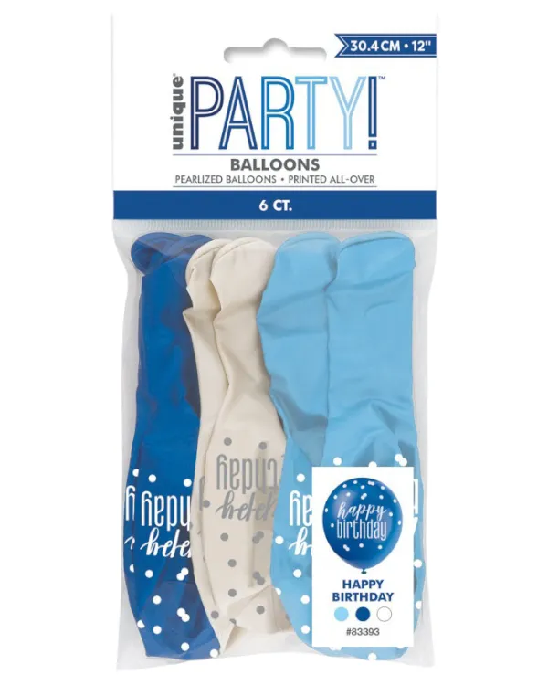 Lateksballonger (6stk): «Happy birthday» – Blå & Sølv Glitz – 30 cm