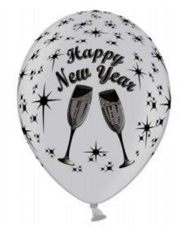 6 stk. Lateksballonger dedikert til nyttårsfeiring. Ballongene er dekorert med champagneglass og teksten «Happy New Year». Ballongene kan bli opptil 30cm store når de blåses opp. Passer perfekt til feiringen av det nye året som kommer. Alle våre lateksballonger er nedbrytbare i naturen på lik linje med eksempelvis eikeblader.