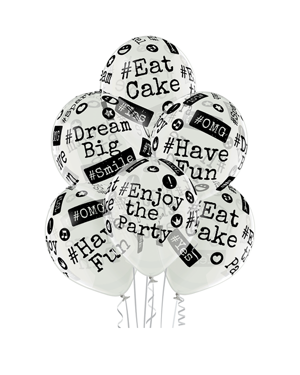 6 stk. Lateksballonger med kule «hashtags». Kommer med crystal-farge som gir en fin og transparent bakgrunnsfarge. Ballongene kan bli opptil 30cm store når de blåses opp. Med emneknager slik som #EatCake, #OMG, #HaveFun og #DreamBig, så er disse ballongene perfekte til festlige lag. Få det ekstra gøy på festen med morsomme dekorasjoner fra The Balloon Company. Alle våre lateksballonger er nedbrytbare i naturen på lik linje med eksempelvis eikeblader.